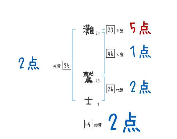 天運![]() | 灘鷲士さんの天運は23画の5つ星!想像力に優れ活力がある。一代で成功し名誉を手に入れる。 家系が持つ宿命的な運勢を表します。祖先から受け継いだ苗字ですので自分の力が及びません。家柄を象徴します。 |