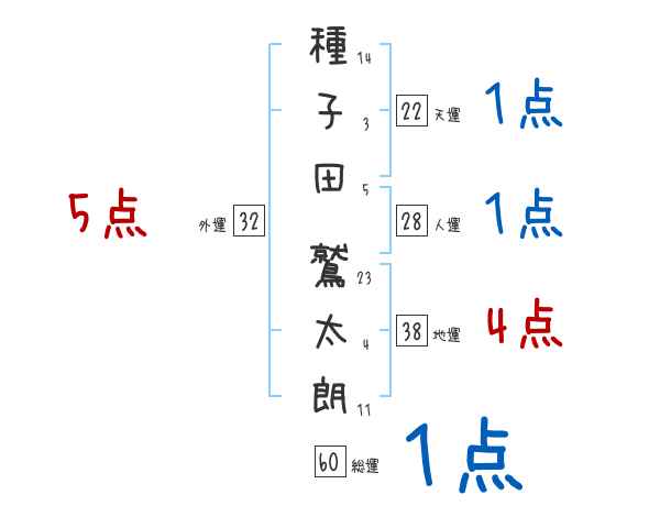 外運![]() | 種子田鷲太朗さんの外運は32画の5つ星!柔軟性があり成功する。チャンスが多く金運が良い。 生活面を象徴する運勢です。外部から受ける影響力を表し、結婚運、家庭運や職場、環境への順応性を表します。 |