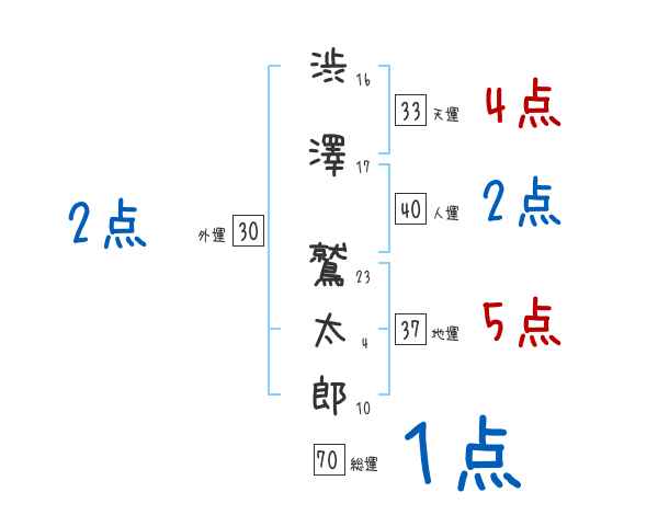 天運![]() | 渋澤鷲太郎さんの天運は33画の4つ星!権力志向でプライドが高い。勇気があり運を切り開き成功する。 家系が持つ宿命的な運勢を表します。祖先から受け継いだ苗字ですので自分の力が及びません。家柄を象徴します。 |