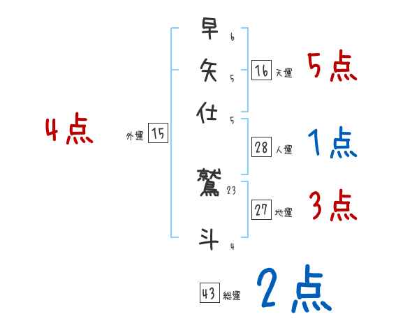 外運![]() | 早矢仕鷲斗さんの外運は15画の4つ星!人徳があり出世する。順調に物事を進め円満な人生。 生活面を象徴する運勢です。外部から受ける影響力を表し、結婚運、家庭運や職場、環境への順応性を表します。 |
