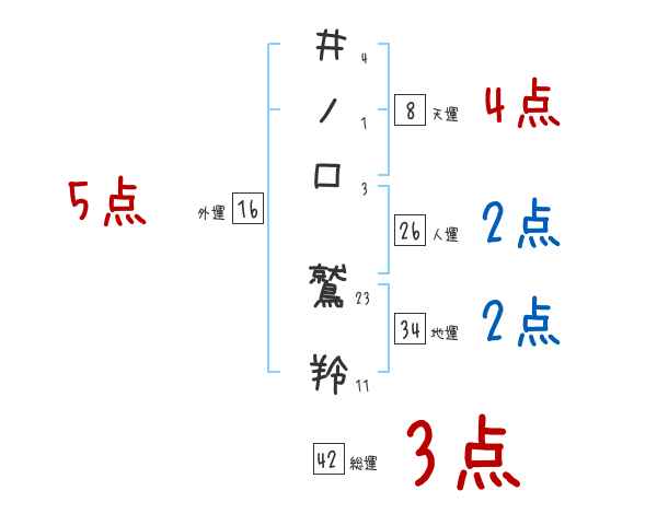 外運![]() | 井ノ口鷲羚さんの外運は16画の5つ星!人望が厚く大きく発展する。逆転成功が見える。 生活面を象徴する運勢です。外部から受ける影響力を表し、結婚運、家庭運や職場、環境への順応性を表します。 |