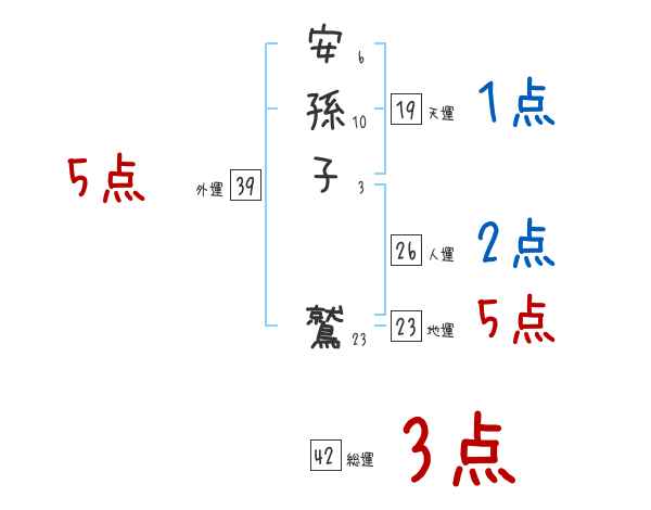 天運![]() | 安孫子鷲さんの天運は19画の1つ星!優れた才能を持ちますが、協調性が足りないことも。周りの人と協力する事を意識しましょう。 家系が持つ宿命的な運勢を表します。祖先から受け継いだ苗字ですので自分の力が及びません。家柄を象徴します。 |