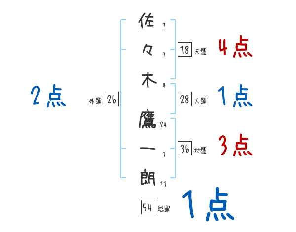 人運![]() | 佐々木鷹一朗さんの人運は28画の1つ星!家庭環境に注意。スポーツで活躍できる能力があるかも。 性格や才能などを表す2番目に重要な運勢です。人間関係や協調性、社会的な成功に影響します。主に20歳から50歳ぐらいまでの中年期の運勢を表します。 |