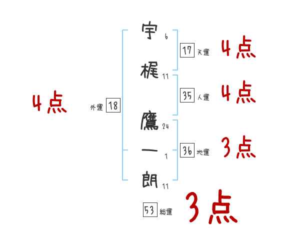 外運![]() | 宇梶鷹一朗さんの外運は18画の4つ星!情熱的で剛気。忍耐力があり信頼される。 生活面を象徴する運勢です。外部から受ける影響力を表し、結婚運、家庭運や職場、環境への順応性を表します。 |