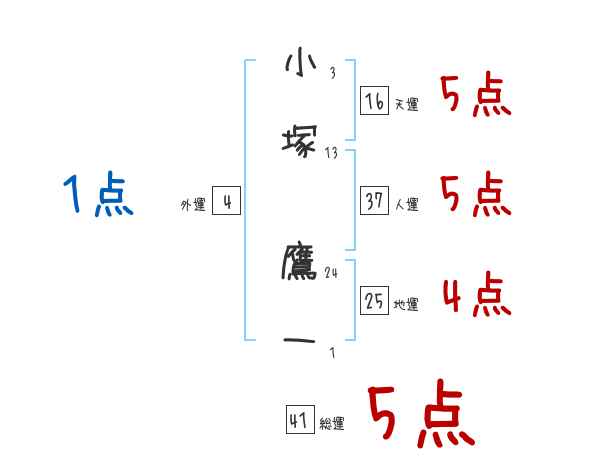 総運![]() | 小塚鷹一さんの総運は41画の5つ星!大志を抱き、目標に向かって実力を発揮し達成する。温和な性格。 あなたの人生を表す1番重要な運勢です。生涯を通じて影響する総合運となり、主に50歳以降の晩年期に影響を及ぼします。 |
