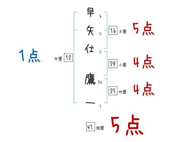 天運![]() | 早矢仕鷹一さんの天運は16画の5つ星!人望が厚く大きく発展する。逆転成功が見える。 家系が持つ宿命的な運勢を表します。祖先から受け継いだ苗字ですので自分の力が及びません。家柄を象徴します。 |