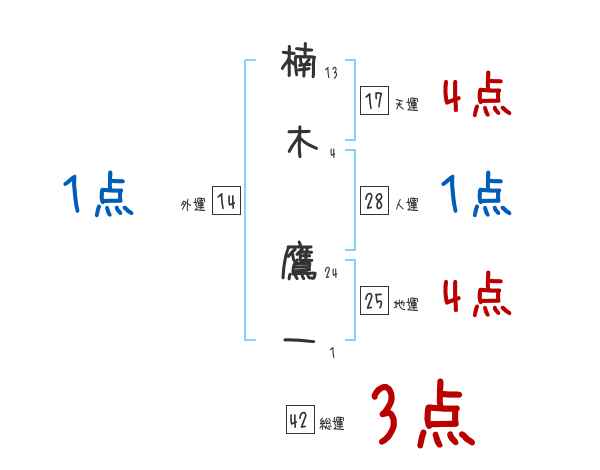 人運![]() | 楠木鷹一さんの人運は28画の1つ星!家庭環境に注意。スポーツで活躍できる能力があるかも。 性格や才能などを表す2番目に重要な運勢です。人間関係や協調性、社会的な成功に影響します。主に20歳から50歳ぐらいまでの中年期の運勢を表します。 |