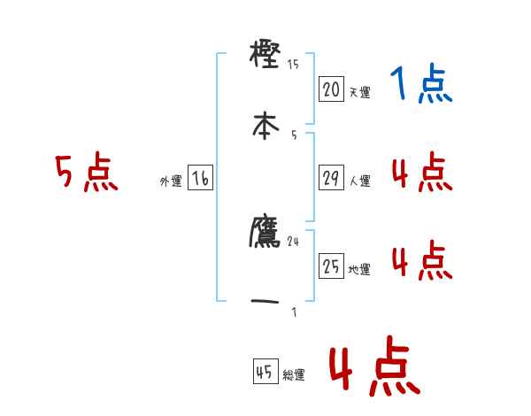 総運![]() | 樫本鷹一さんの総運は45画の4つ星!もくもくと物事を進め達成する。地味な努力家。 あなたの人生を表す1番重要な運勢です。生涯を通じて影響する総合運となり、主に50歳以降の晩年期に影響を及ぼします。 |