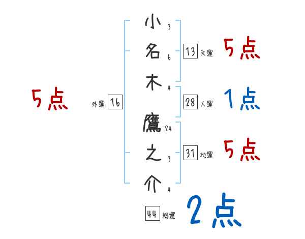 総運![]() | 小名木鷹之介さんの総運は44画の2つ星!誠実で慎重な性格。物事を考えすぎないように注意しましょう。 あなたの人生を表す1番重要な運勢です。生涯を通じて影響する総合運となり、主に50歳以降の晩年期に影響を及ぼします。 |