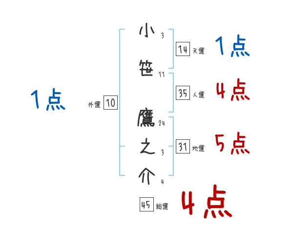 総運![]() | 小笹鷹之介さんの総運は45画の4つ星!もくもくと物事を進め達成する。地味な努力家。 あなたの人生を表す1番重要な運勢です。生涯を通じて影響する総合運となり、主に50歳以降の晩年期に影響を及ぼします。 |