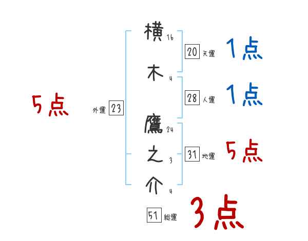 総運![]() | 横木鷹之介さんの総運は51画の3つ星!変化が激しく、危険に注意。堅実な性格。 あなたの人生を表す1番重要な運勢です。生涯を通じて影響する総合運となり、主に50歳以降の晩年期に影響を及ぼします。 |