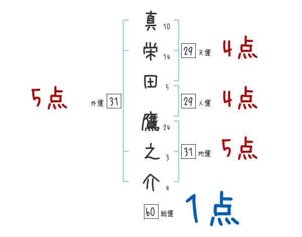 天運![]() | 真栄田鷹之介さんの天運は29画の4つ星!完全主義で才能がある。厳格な心の持ち主。 家系が持つ宿命的な運勢を表します。祖先から受け継いだ苗字ですので自分の力が及びません。家柄を象徴します。 |