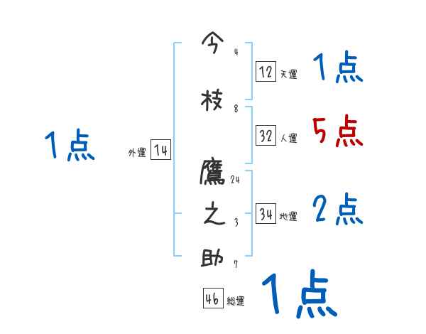 人運![]() | 今枝鷹之助さんの人運は32画の5つ星!柔軟性があり成功する。チャンスが多く金運が良い。 性格や才能などを表す2番目に重要な運勢です。人間関係や協調性、社会的な成功に影響します。主に20歳から50歳ぐらいまでの中年期の運勢を表します。 |