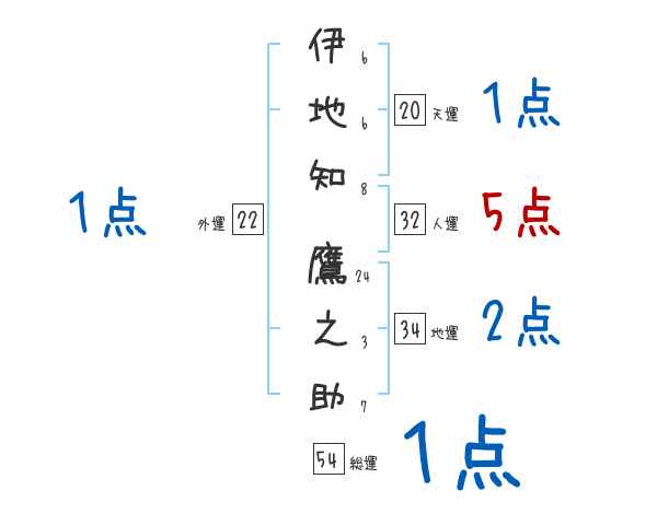 外運![]() | 伊地知鷹之助さんの外運は22画の1つ星!努力することが苦手ないっぽう手先が器用。芸術性にも優れる。 生活面を象徴する運勢です。外部から受ける影響力を表し、結婚運、家庭運や職場、環境への順応性を表します。 |