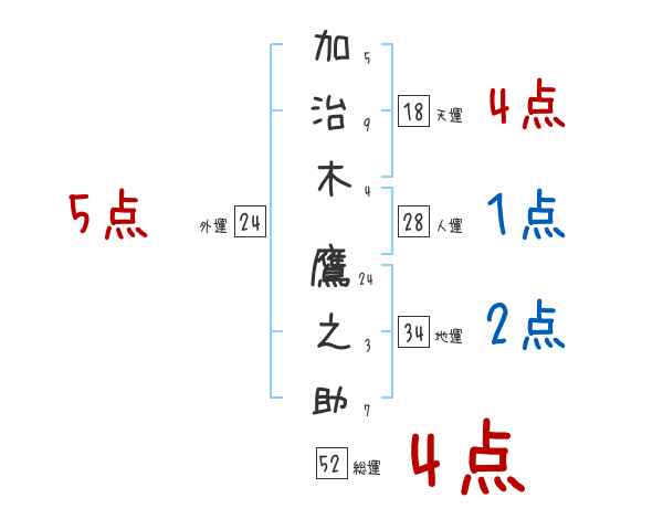 外運![]() | 加治木鷹之助さんの外運は24画の5つ星!家庭運が良く順調な人生。金運にも恵まれる。 生活面を象徴する運勢です。外部から受ける影響力を表し、結婚運、家庭運や職場、環境への順応性を表します。 |
