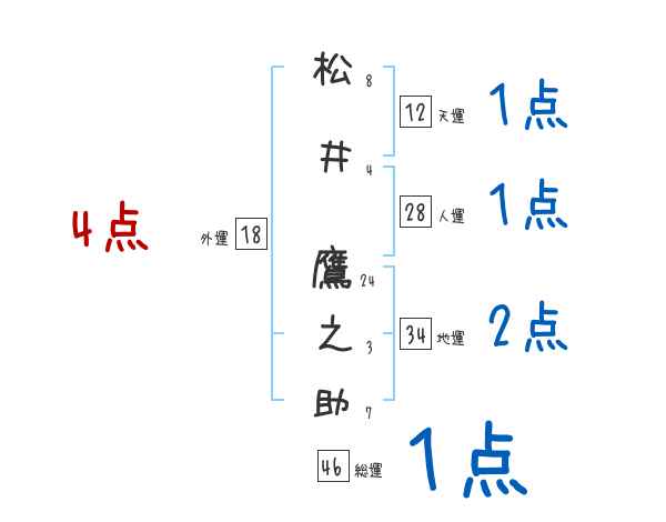 人運![]() | 松井鷹之助さんの人運は28画の1つ星!家庭環境に注意。スポーツで活躍できる能力があるかも。 性格や才能などを表す2番目に重要な運勢です。人間関係や協調性、社会的な成功に影響します。主に20歳から50歳ぐらいまでの中年期の運勢を表します。 |