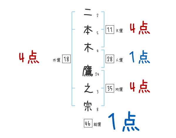 二本木鷹之宗さんの画数の鑑定結果