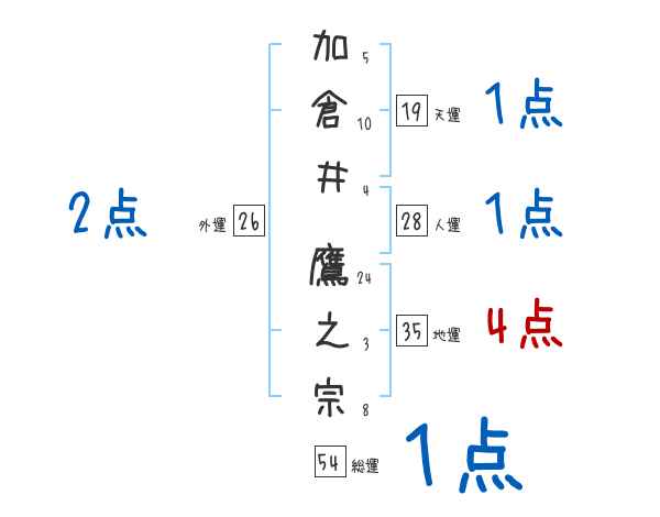 地運![]() | 加倉井鷹之宗さんの地運は35画の4つ星!温厚な性格で感受性が高い。穏和な性格で人望が厚い。 個性を表す基礎的な運勢です。性格形成や対人関係、行動力など家庭環境に影響されます。主に誕生してから20歳くらいまでの若年期の運勢を表します。 |
