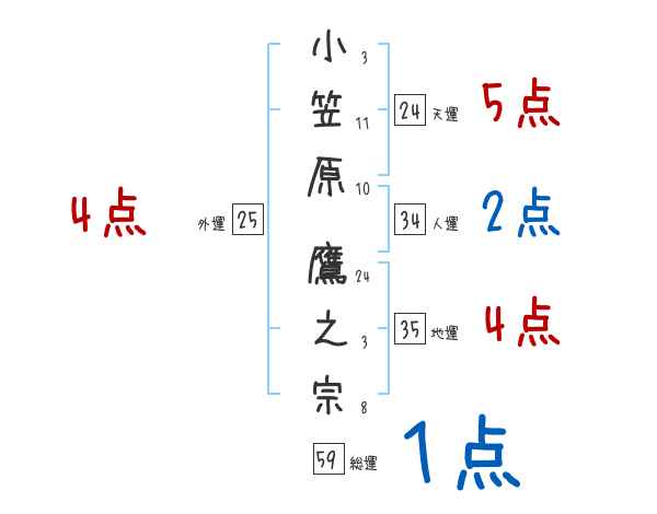 天運![]() | 小笠原鷹之宗さんの天運は24画の5つ星!家庭運が良く順調な人生。金運にも恵まれる。 家系が持つ宿命的な運勢を表します。祖先から受け継いだ苗字ですので自分の力が及びません。家柄を象徴します。 |