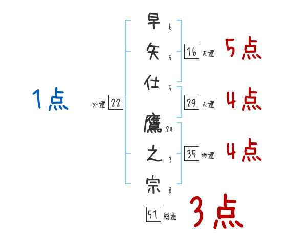 総運![]() | 早矢仕鷹之宗さんの総運は51画の3つ星!変化が激しく、危険に注意。堅実な性格。 あなたの人生を表す1番重要な運勢です。生涯を通じて影響する総合運となり、主に50歳以降の晩年期に影響を及ぼします。 |