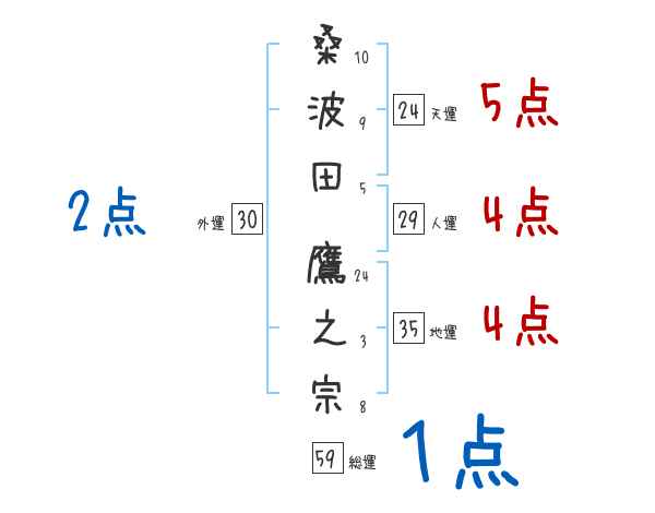 地運![]() | 桑波田鷹之宗さんの地運は35画の4つ星!温厚な性格で感受性が高い。穏和な性格で人望が厚い。 個性を表す基礎的な運勢です。性格形成や対人関係、行動力など家庭環境に影響されます。主に誕生してから20歳くらいまでの若年期の運勢を表します。 |