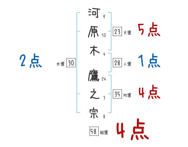 天運![]() | 河原木鷹之宗さんの天運は23画の5つ星!想像力に優れ活力がある。一代で成功し名誉を手に入れる。 家系が持つ宿命的な運勢を表します。祖先から受け継いだ苗字ですので自分の力が及びません。家柄を象徴します。 |