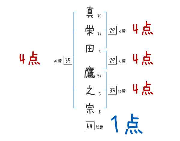 天運![]() | 真栄田鷹之宗さんの天運は29画の4つ星!完全主義で才能がある。厳格な心の持ち主。 家系が持つ宿命的な運勢を表します。祖先から受け継いだ苗字ですので自分の力が及びません。家柄を象徴します。 |