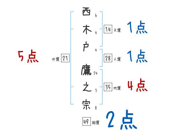 西木戸鷹之宗さんの画数の鑑定結果