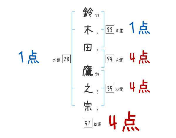 外運![]() | 鈴木田鷹之宗さんの外運は28画の1つ星!家庭環境に注意。スポーツで活躍できる能力があるかも。 生活面を象徴する運勢です。外部から受ける影響力を表し、結婚運、家庭運や職場、環境への順応性を表します。 |