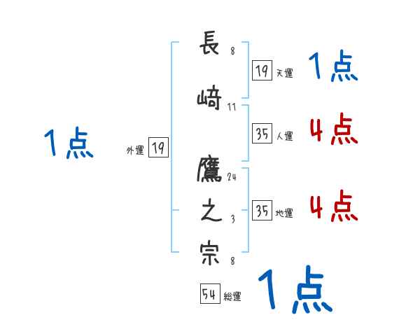 外運![]() | 長﨑鷹之宗さんの外運は19画の1つ星!優れた才能を持ちますが、協調性が足りないことも。周りの人と協力する事を意識しましょう。 生活面を象徴する運勢です。外部から受ける影響力を表し、結婚運、家庭運や職場、環境への順応性を表します。 |