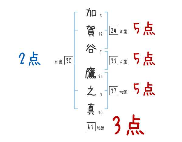 総運![]() | 加賀谷鷹之真さんの総運は61画の3つ星!強情な性格でうぬぼれタイプ。自ら破滅する。 あなたの人生を表す1番重要な運勢です。生涯を通じて影響する総合運となり、主に50歳以降の晩年期に影響を及ぼします。 |