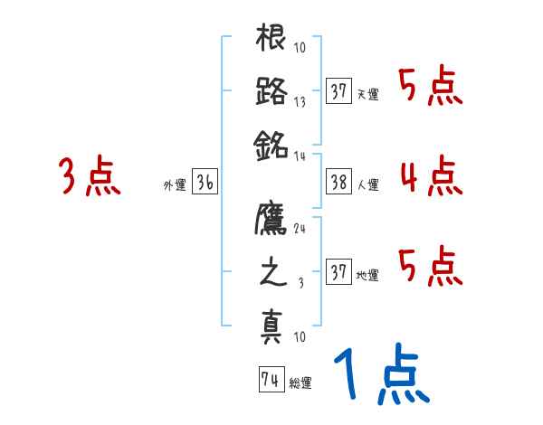 総運![]() | 根路銘鷹之真さんの総運は74画の1つ星!無気力で怠惰な生活送りがち。規則正しい生活を送るよう気をつけましょう。 あなたの人生を表す1番重要な運勢です。生涯を通じて影響する総合運となり、主に50歳以降の晩年期に影響を及ぼします。 |