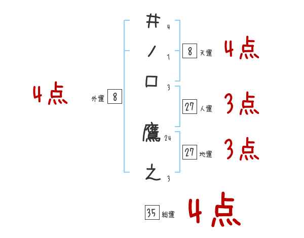 総運![]() | 井ノ口鷹之さんの総運は35画の4つ星!温厚な性格で感受性が高い。穏和な性格で人望が厚い。 あなたの人生を表す1番重要な運勢です。生涯を通じて影響する総合運となり、主に50歳以降の晩年期に影響を及ぼします。 |