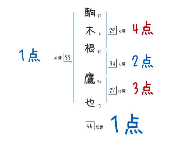 外運![]() | 駒木根鷹也さんの外運は22画の1つ星!努力することが苦手ないっぽう手先が器用。芸術性にも優れる。 生活面を象徴する運勢です。外部から受ける影響力を表し、結婚運、家庭運や職場、環境への順応性を表します。 |