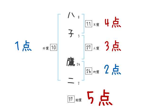 地運![]() | 八子鷹二さんの地運は26画の2つ星!波瀾万丈かも。信頼できる人を大事にしましょう。 個性を表す基礎的な運勢です。性格形成や対人関係、行動力など家庭環境に影響されます。主に誕生してから20歳くらいまでの若年期の運勢を表します。 |