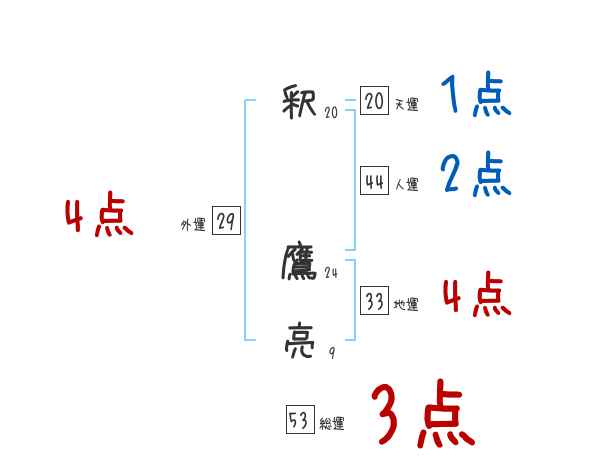 人運![]() | 釈鷹亮さんの人運は44画の2つ星!誠実で慎重な性格。物事を考えすぎないように注意しましょう。 性格や才能などを表す2番目に重要な運勢です。人間関係や協調性、社会的な成功に影響します。主に20歳から50歳ぐらいまでの中年期の運勢を表します。 |