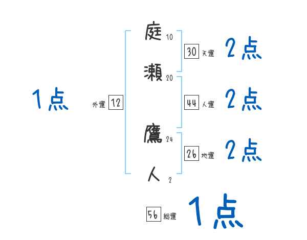 天運![]() | 庭瀬鷹人さんの天運は30画の2つ星!浮き沈みの激しさに注意しましょう。 家系が持つ宿命的な運勢を表します。祖先から受け継いだ苗字ですので自分の力が及びません。家柄を象徴します。 |