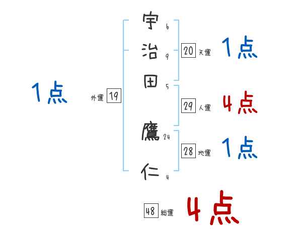 人運![]() | 宇治田鷹仁さんの人運は29画の4つ星!完全主義で才能がある。厳格な心の持ち主。 性格や才能などを表す2番目に重要な運勢です。人間関係や協調性、社会的な成功に影響します。主に20歳から50歳ぐらいまでの中年期の運勢を表します。 |