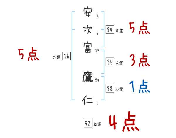 天運![]() | 安次富鷹仁さんの天運は24画の5つ星!家庭運が良く順調な人生。金運にも恵まれる。 家系が持つ宿命的な運勢を表します。祖先から受け継いだ苗字ですので自分の力が及びません。家柄を象徴します。 |