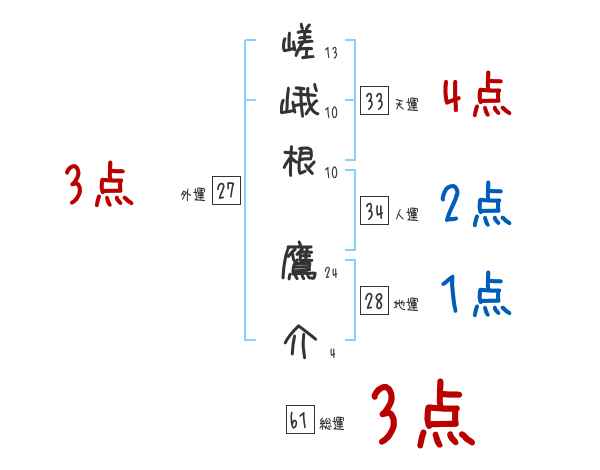 天運![]() | 嵯峨根鷹介さんの天運は33画の4つ星!権力志向でプライドが高い。勇気があり運を切り開き成功する。 家系が持つ宿命的な運勢を表します。祖先から受け継いだ苗字ですので自分の力が及びません。家柄を象徴します。 |