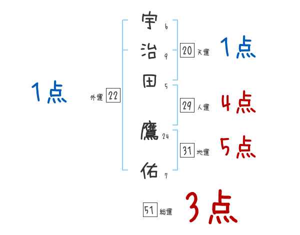 外運![]() | 宇治田鷹佑さんの外運は22画の1つ星!努力することが苦手ないっぽう手先が器用。芸術性にも優れる。 生活面を象徴する運勢です。外部から受ける影響力を表し、結婚運、家庭運や職場、環境への順応性を表します。 |