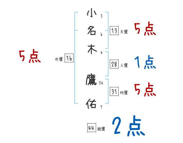 総運![]() | 小名木鷹佑さんの総運は44画の2つ星!誠実で慎重な性格。物事を考えすぎないように注意しましょう。 あなたの人生を表す1番重要な運勢です。生涯を通じて影響する総合運となり、主に50歳以降の晩年期に影響を及ぼします。 |