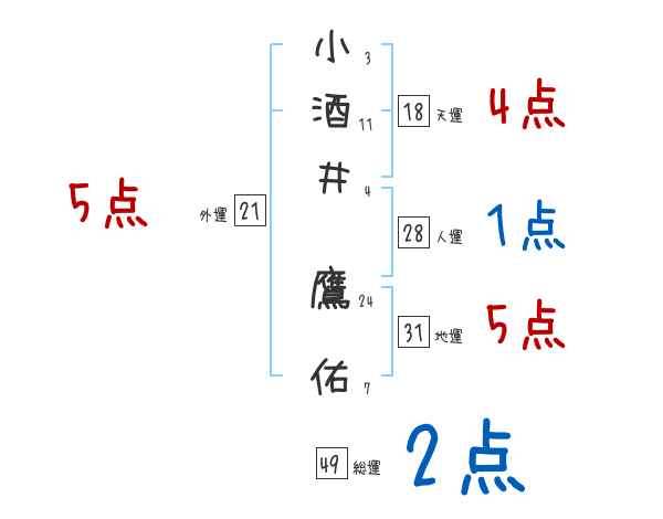 外運![]() | 小酒井鷹佑さんの外運は21画の5つ星!統率力がある。独立し成功する。名誉を手に入れる。 生活面を象徴する運勢です。外部から受ける影響力を表し、結婚運、家庭運や職場、環境への順応性を表します。 |