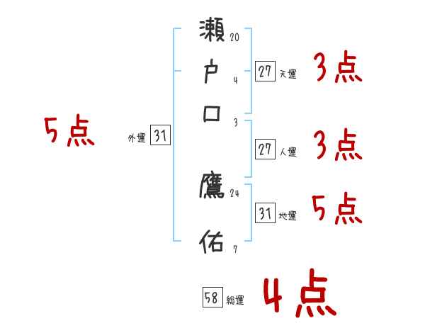 総運![]() | 瀬戸口鷹佑さんの総運は58画の4つ星!安定した生活。大器晩成タイプ。 あなたの人生を表す1番重要な運勢です。生涯を通じて影響する総合運となり、主に50歳以降の晩年期に影響を及ぼします。 |