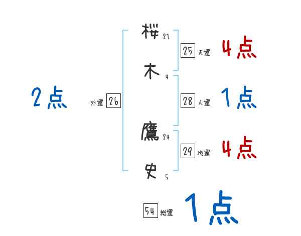 天運![]() | 桜木鷹史さんの天運は25画の4つ星!個性があり才能があふれる。強運の持ち主で発展する。 家系が持つ宿命的な運勢を表します。祖先から受け継いだ苗字ですので自分の力が及びません。家柄を象徴します。 |