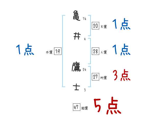 総運![]() | 亀井鷹士さんの総運は47画の5つ星!実力が開花し発展する円満な人生。財に恵まれる。 あなたの人生を表す1番重要な運勢です。生涯を通じて影響する総合運となり、主に50歳以降の晩年期に影響を及ぼします。 |