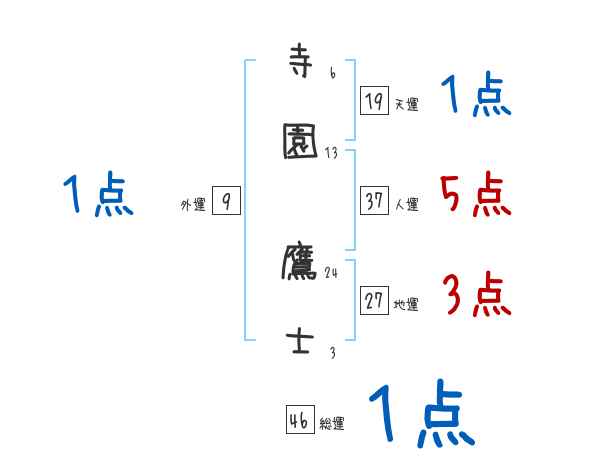 天運![]() | 寺園鷹士さんの天運は19画の1つ星!優れた才能を持ちますが、協調性が足りないことも。周りの人と協力する事を意識しましょう。 家系が持つ宿命的な運勢を表します。祖先から受け継いだ苗字ですので自分の力が及びません。家柄を象徴します。 |