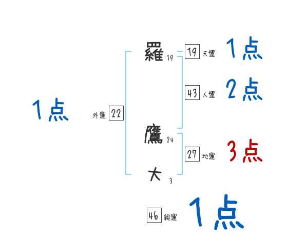 天運![]() | 羅鷹大さんの天運は19画の1つ星!優れた才能を持ちますが、協調性が足りないことも。周りの人と協力する事を意識しましょう。 家系が持つ宿命的な運勢を表します。祖先から受け継いだ苗字ですので自分の力が及びません。家柄を象徴します。 |