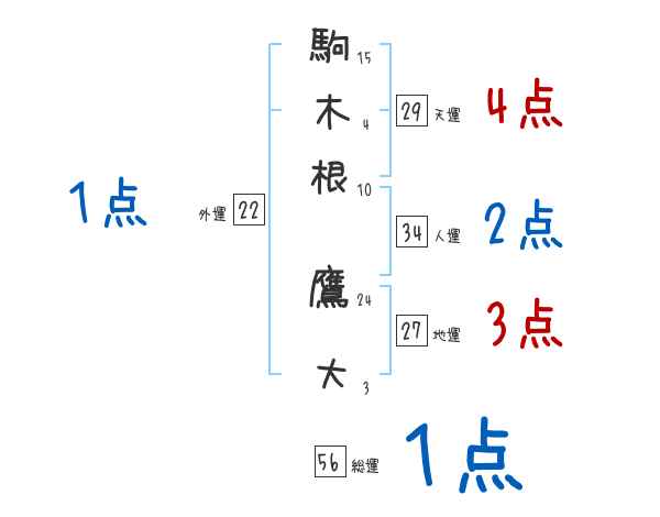 外運![]() | 駒木根鷹大さんの外運は22画の1つ星!努力することが苦手ないっぽう手先が器用。芸術性にも優れる。 生活面を象徴する運勢です。外部から受ける影響力を表し、結婚運、家庭運や職場、環境への順応性を表します。 |