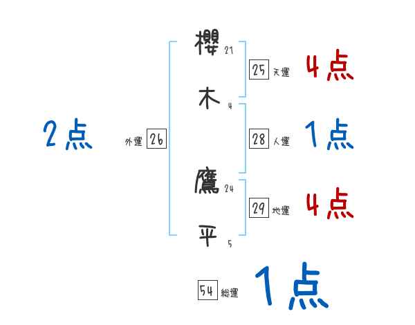 外運![]() | 櫻木鷹平さんの外運は26画の2つ星!波瀾万丈かも。信頼できる人を大事にしましょう。 生活面を象徴する運勢です。外部から受ける影響力を表し、結婚運、家庭運や職場、環境への順応性を表します。 |